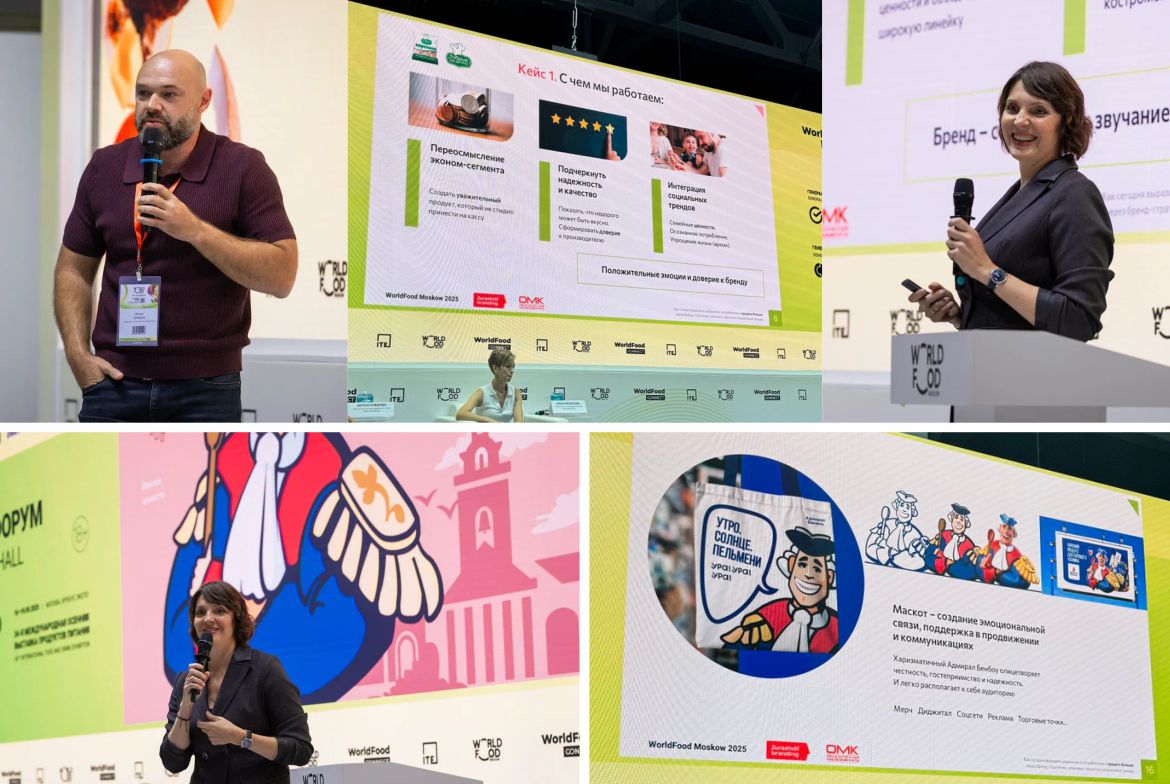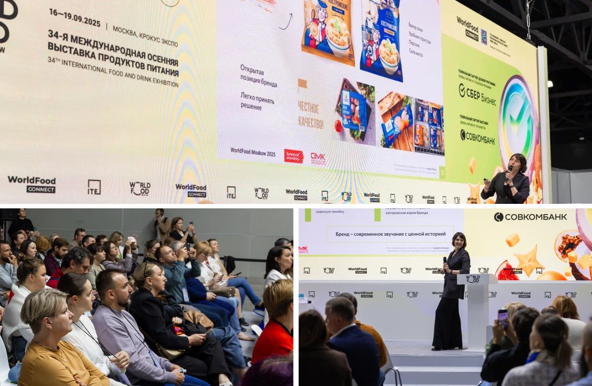 19/09/25. Ольга Зурашвили совместно с партнерами агентства – генеральным директором холдинга «Объединенные мясокомбинаты» ООО «ОМК-КОСТРОМА» Антоном Кувариным и Ольгой Моисеевой, руководителем отдела маркетинга – выступила с темой: «Как сегодня выразить уважение к потребителю и продать больше через бренд-стратегию, упаковку, маскота и социальные тренды».