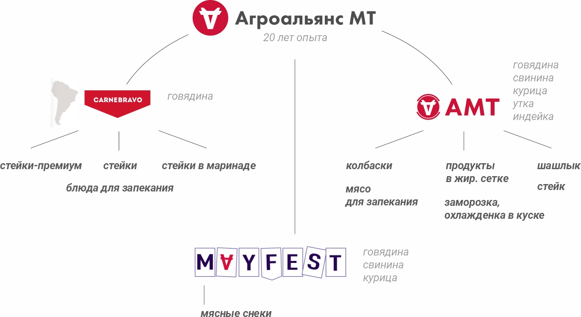 Когда Агроальянс МТ – один из ведущих импортеров и дистрибьюторов мяса в России – принял решение выйти в розницу, задача звучала не так: «создайте нам бренд». Задача звучала иначе: «нам нужны собственные розничных торговых марки под разные сценарии потребления – и они не должны мешать ни друг другу, ни корпоративному B2B-бренду».